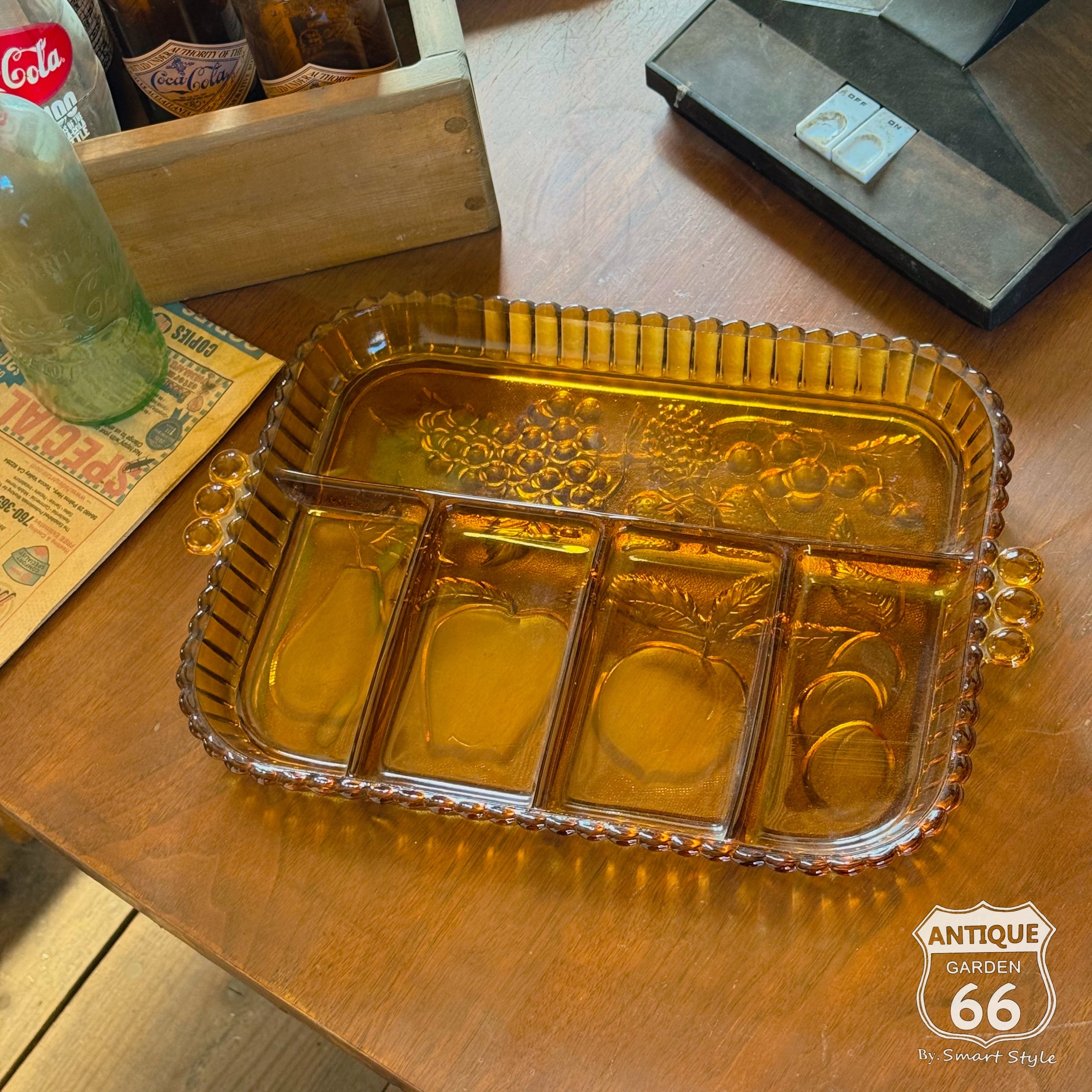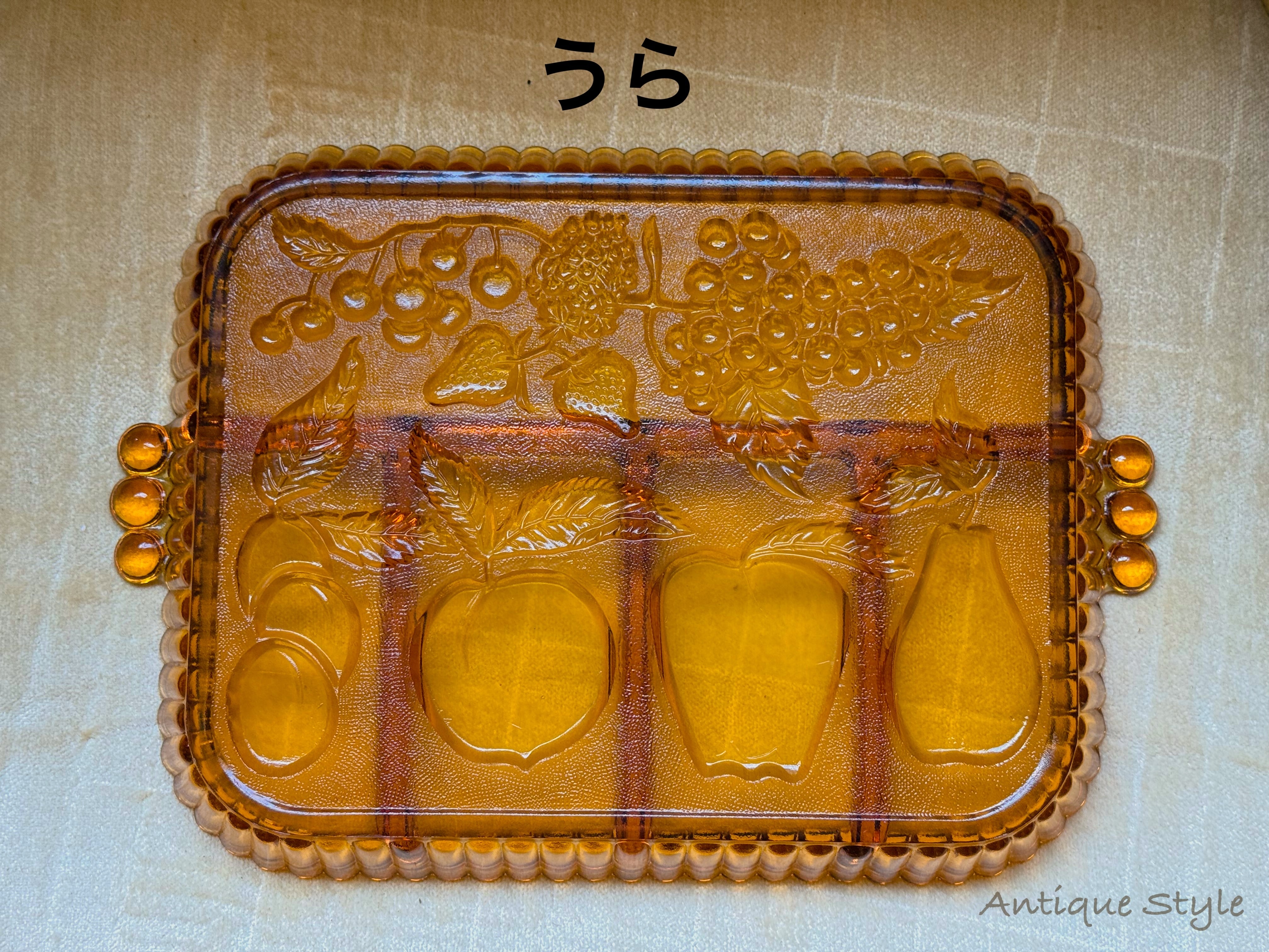 ヴィンテージ アンバー ガラス 5パート 仕切り 付き トレイ フルーツ柄 インディアナグラス トレイ【H-096-002】
