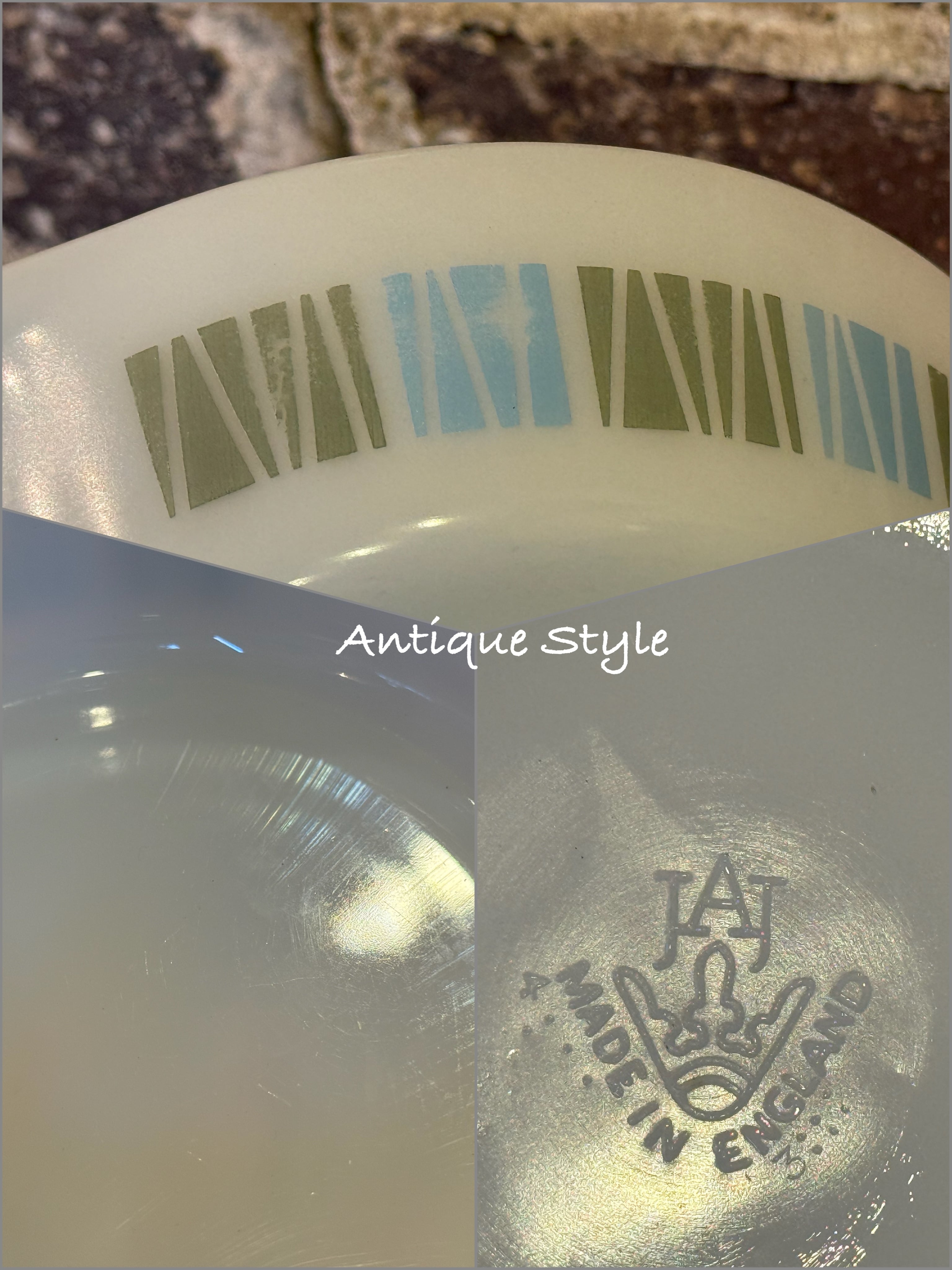 乳白色のミルクガラスに、モスグリーンと水色が交互の